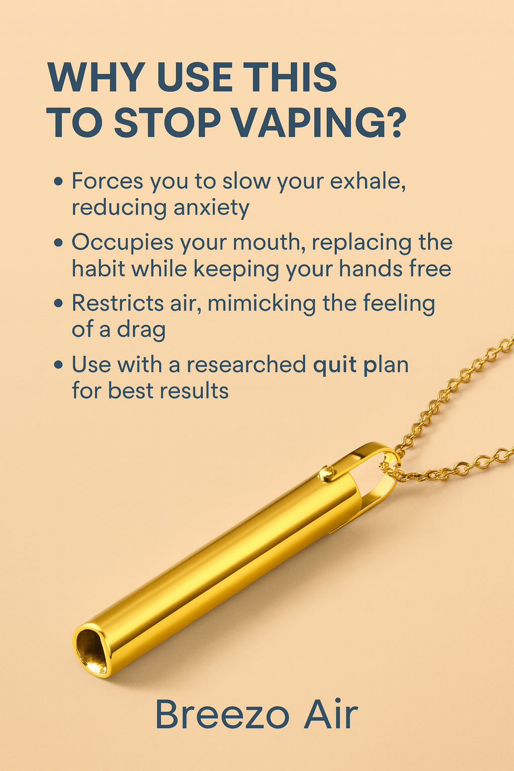 See the trigger (after meals, driving, stress). Inhale normally through your nose. Exhale through Breezo Air—long and smooth—until the craving passes. Swap the routine: when you’d normally vape/smoke, breathe out instead. Use daily with a clear quit plan and support. Breezo Air isn’t a medical device—it’s a powerful, physical cue that helps you stay calm and committed.